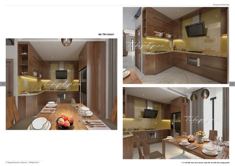 Một gợi ý thiết kế phòng bếp - ăn ấn tượng dành cho các căn hộ chung cư cao cấp mang phong cách hiện đại. Hệ thống tủ bếp gỗ nâu sang trọng, tiện lợi