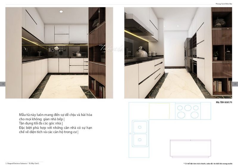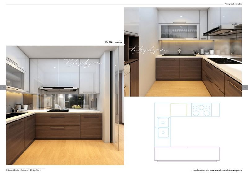 Tủ bếp kiểu chữ L với 2 màu sắc khác nhau trên và dưới được thiết kế để tránh làm cho không gian bếp của căn hộ bị nhàm chán.
